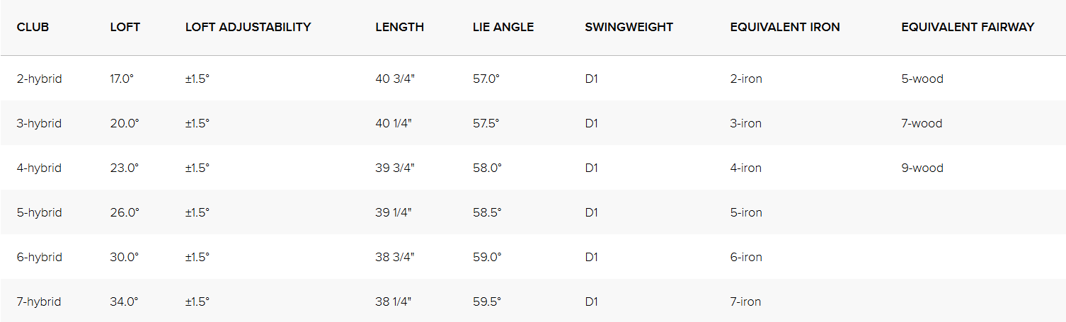 Loft : 17* (Hybrid 2), 19* (Hybrid 3), 22* (Hybrid 4), 26* (Hybrid 5), 30* (Hybrid 6)